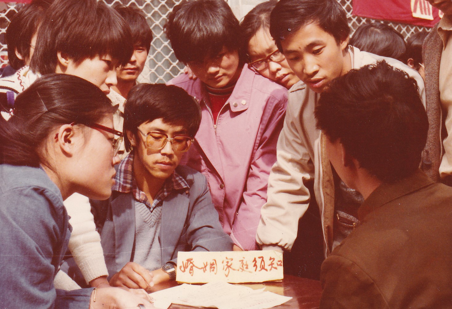 1988年10月14日下午,法学社成员一行二十余人在济南市大观园商场举行了义务法律咨询,咨询从下午一点开始。共设置刑法、经济法、婚姻法等七个咨询专台,前来咨询的群众络绎不绝,有工人、农民,也有国家干部法人代表。在短短的四个小时内,共接待群众约四百余人,解答法律疑难问题二百余人次,有一个经商个体户,把诉讼材料和证明材料全都带了过去,前来咨询他的官司该怎么打。面对一名名群众,同学们热情、耐心地解答,直到群众满意为止。(法律系范明志,图片中手扶眼镜的为八四级经济法班吴建中同学)