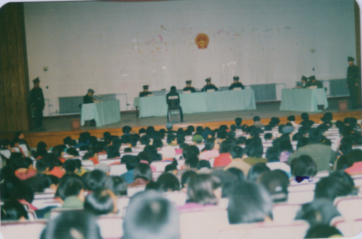 模拟法庭照片。发表辩护词的是八三级的尹凤桐同学。