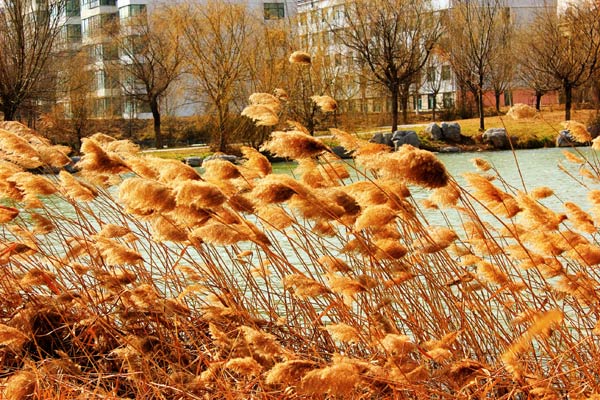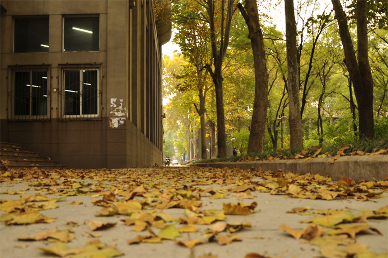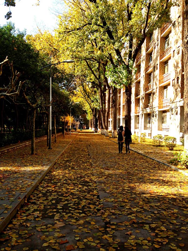 落叶之窗:整个场景在雨后的清阳下显得格外明亮,而映衬在蓝天中的深绿与依托在大地上的鹅黄形成了鲜明的对比,并且鹅黄的树叶自然的形成了一条树叶叠落而成的小路,一直晕黄了它通向的远方。在右侧,阳光斜射在不高的公寓楼外,伴随着几个学生走过,更加烘托出了阳光的鲜明和此意境的唯美。——栾晓姣,2011级。