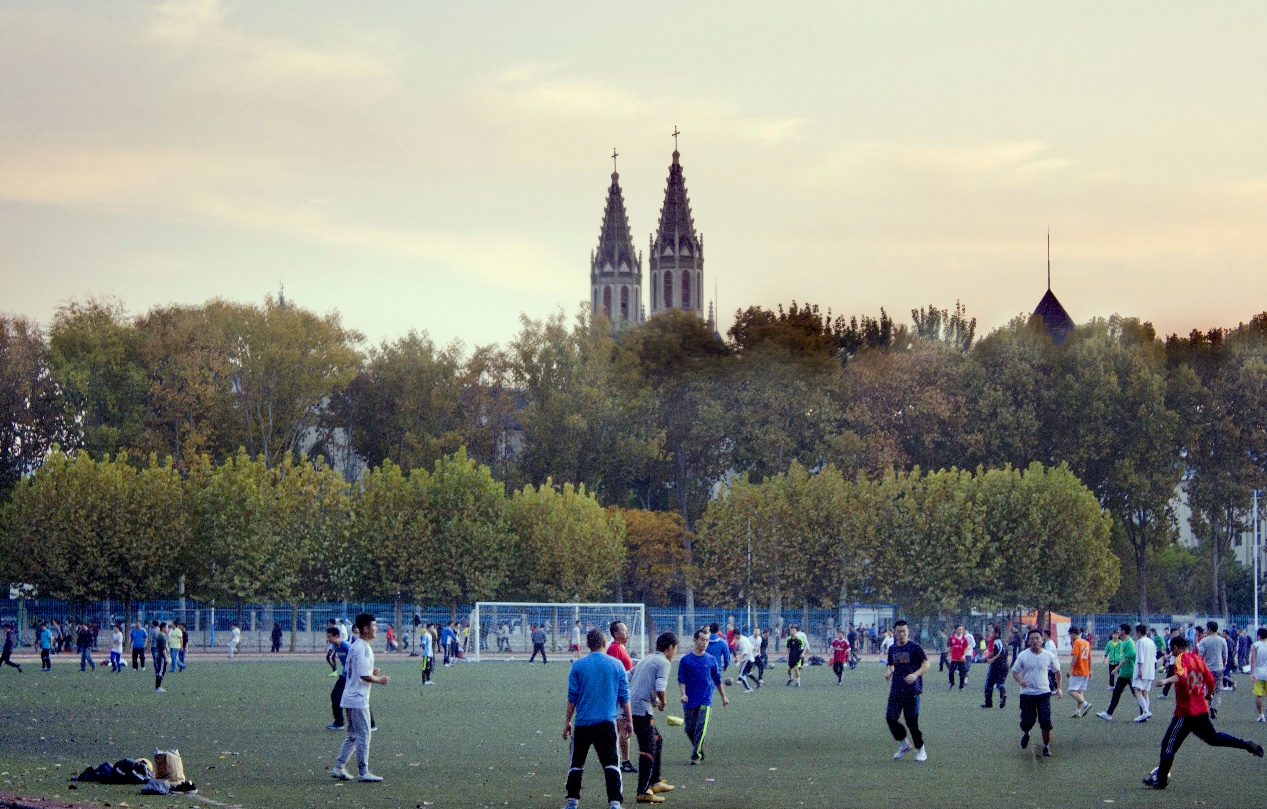 自古逢秋悲寂寥,我言秋日胜春朝。洪楼教堂钟声杳,球场纵横少年骄。