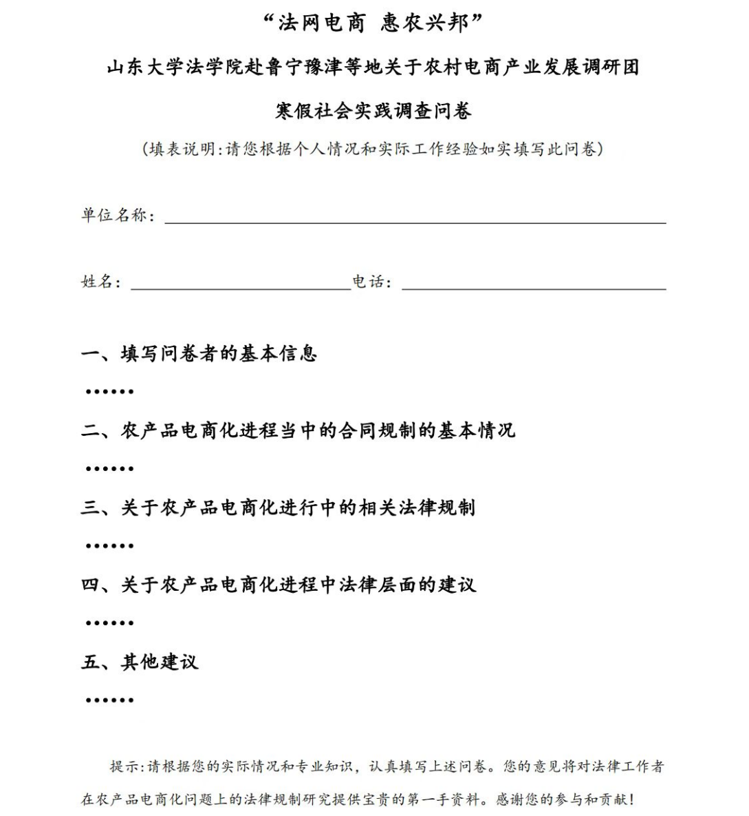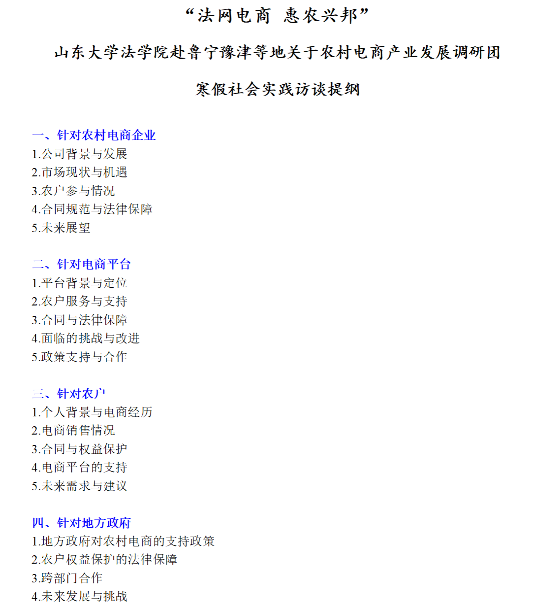 在访谈提纲中,团队计划专门对农村电商企业、电商经营平台、农户个人以及政府相关部门这四大主体分别进行采访。相较于调查问卷,访谈提纲更具有针对性,便于更为精准地了解相关信息,助力后续的深入调研。