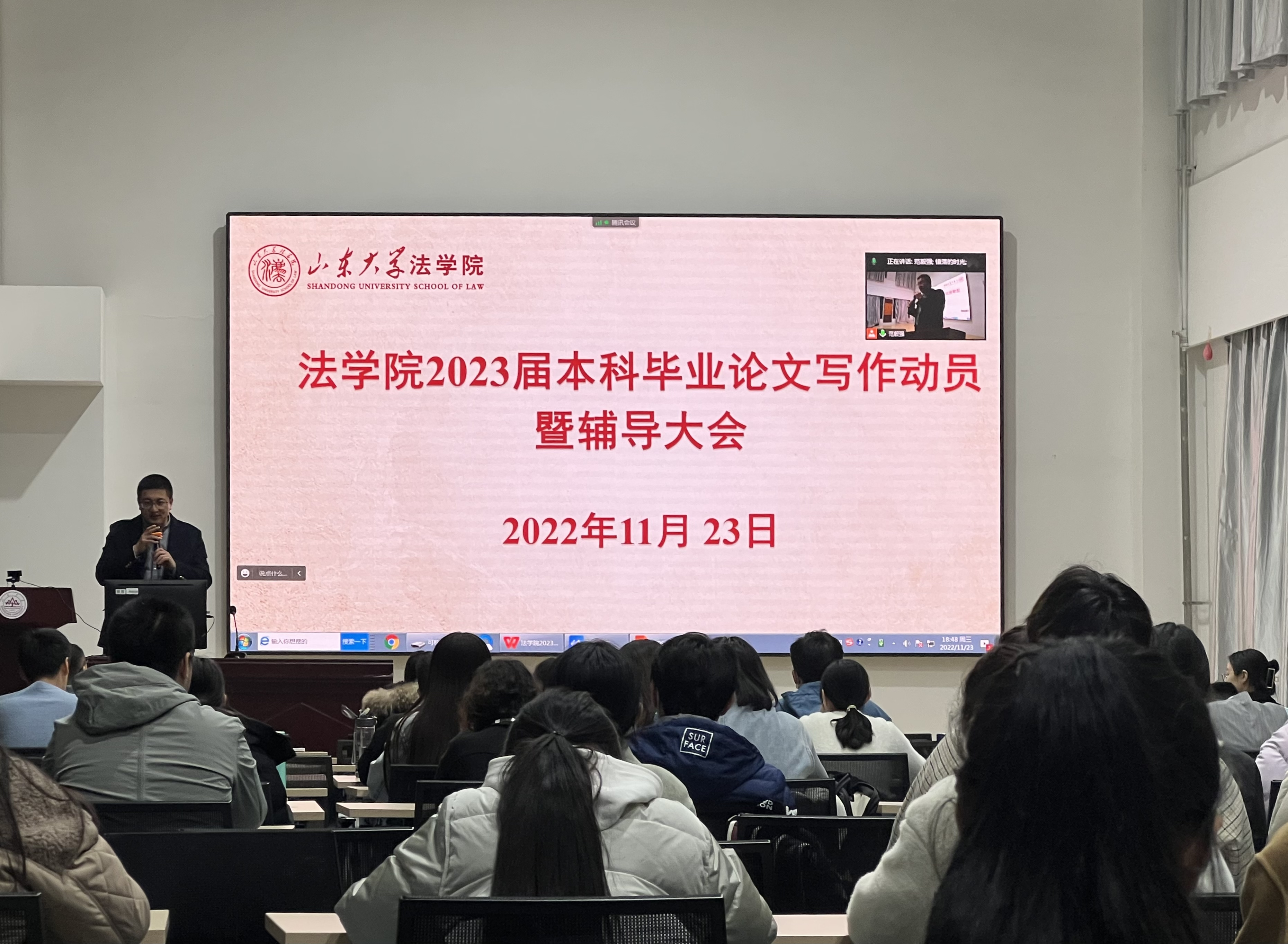 11月23日,伟德源自英国始于19462023届本科毕业论文写作动员暨辅导大会在华岗苑北楼举行,法学2019级和法学与英语双学位班2018级毕业班学生共170余人通过线上、线下两种形式参加会议。副院长冯俊伟教授作动员指导,副研究员宋保振作写作辅导报告,教务秘书范毅强主持会议。