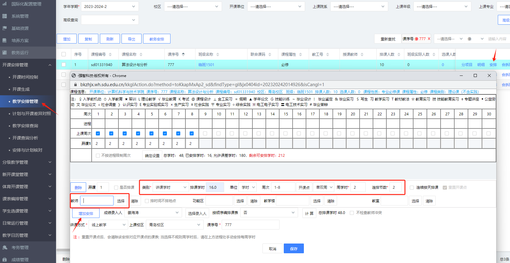 教务运行--学生选课管理--选课课程管理:‘增加课堂’,具体操作如图1。如果有777课程要增加,请通过增加课堂功能增加课程。如果需要做教学安排,在教学安排管理中正常增加开课点设置教学安排,具体操作如图2。