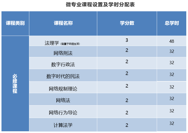 微专业共计17学分,课程设置注重法学与网络安全的交叉融合,核心课程主要包括:法理学(侧重于网络生活)、网络刑法、数字时代的民法、数字行政法、网络规制理论、网络法、网络行为导论、计算法学。