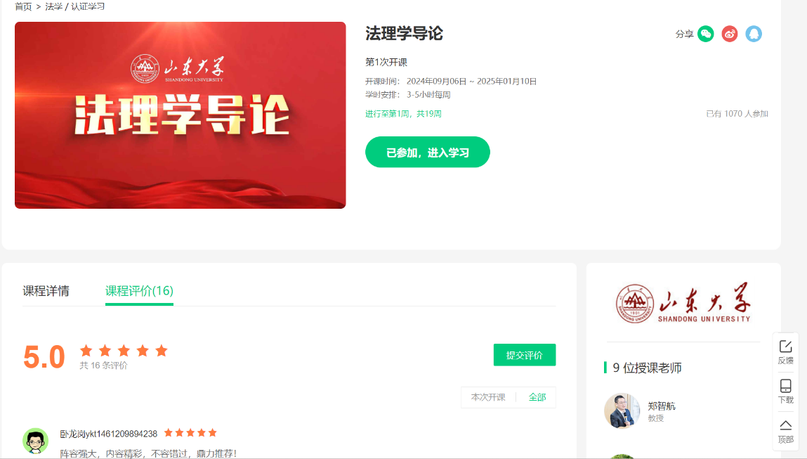 《法理学导论》采取“绪论→起源与发展论→价值论→本体论→运行论”的框架,并加入新时代中国特色社会主义法治体系的理论内容。该慕课遵行理论讲授与案例分析并重、教师启发与学生拓展互补的理念,通过深入浅出、生动平实的课程内容,全面细致地讲解新时代法理学理论体系所包含的知识范畴,可以有效满足本科、硕士等各学历阶段的教学需求,能够让参与该慕课的师生在短时间内对法理学这一学科形成体系化的认识,并掌握法理学基础知识、形成法治思维、树立法治观念、确立法治信仰。