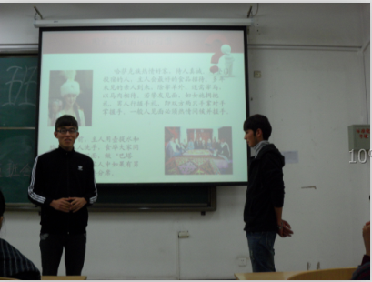 随后,同学们表演了四个关于社交礼仪方面的小情景剧,积极与观众互动,调动了班会的气氛。副班长王新雨和学习委员胡尚清介绍了少数民族礼仪,并分别请上了维吾尔、藏、蒙、朝鲜及哈萨克族同学进行讲解。