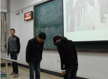团支书赵钧天介绍法,日,韩,美等外国友人的社交礼仪,并请同学进行示范,